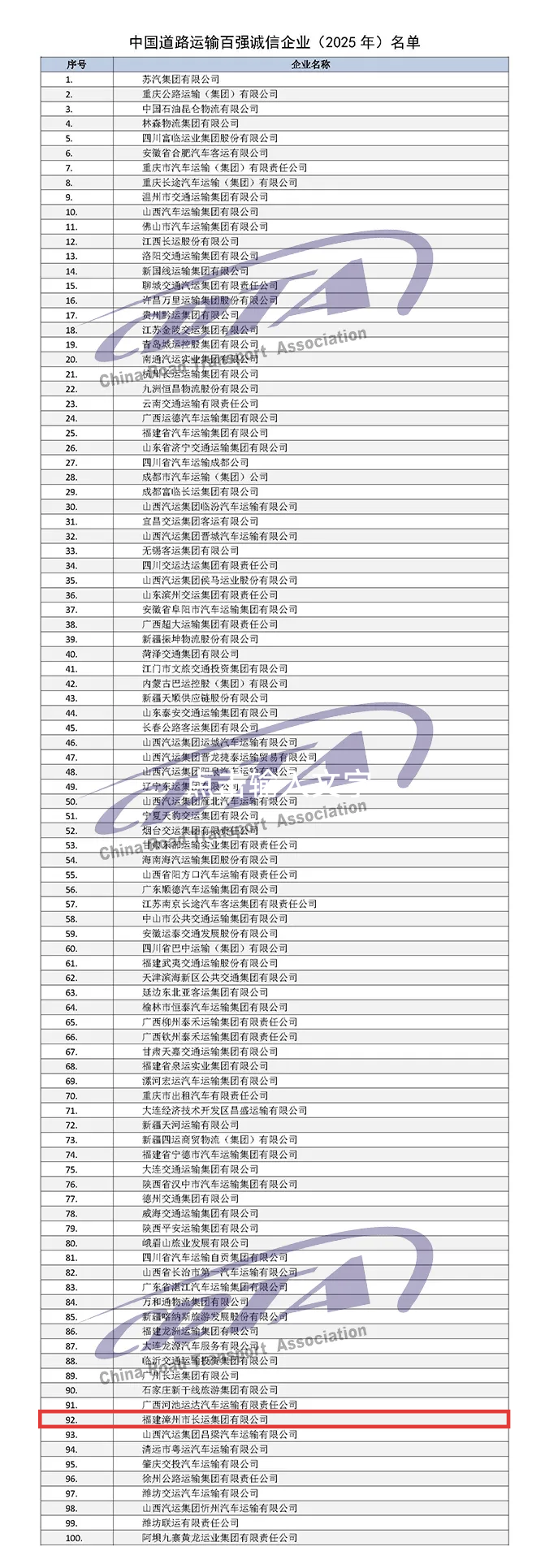 交通集團權屬企業漳州長運集團憑借在誠信經營、服務質量與社會責任等方面的優異表現獲得行業認可,在大會表彰環節,被授予“2025年中國道路運輸百強誠信企業”榮譽。自2016年起每年蟬聯百強誠信企業殊榮。
